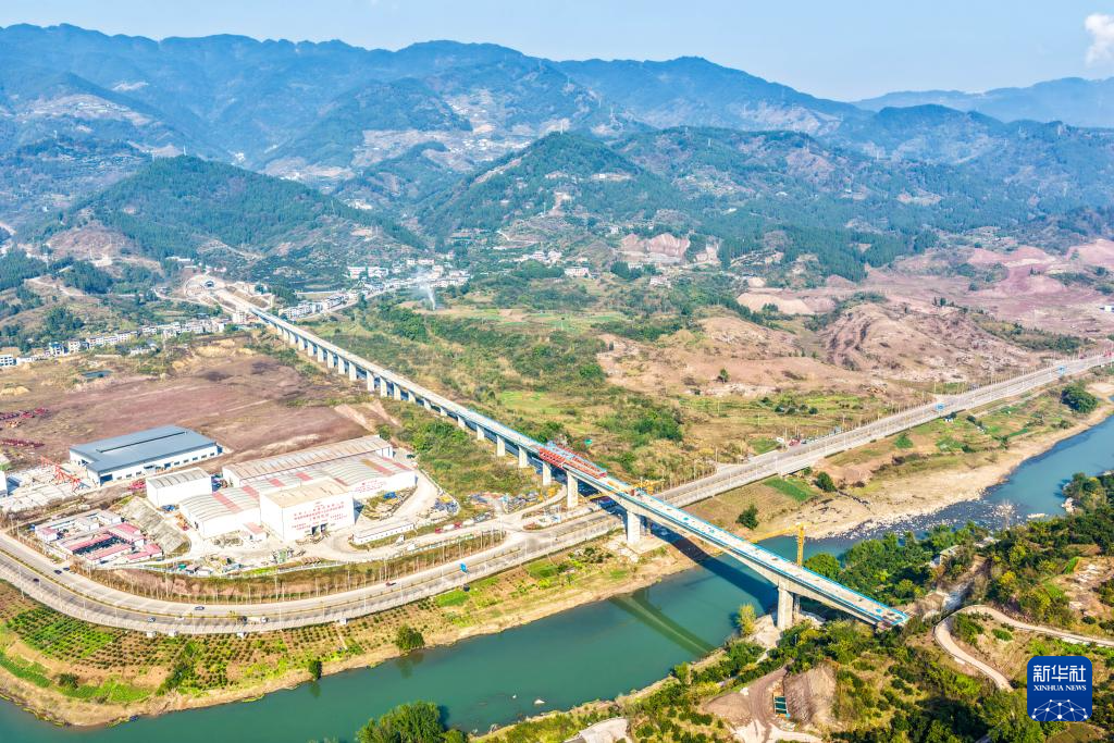 这是12月27日拍摄的渝西高铁赵家铺里河大桥施工现场(无人机照片)。当日,西渝高铁(西渝高铁)赵家堡里河大桥在移动模板上完成最后一根现浇梁的浇筑作业,实现全桥合龙。西渝高铁赵家堡里河大桥位于重庆市开州区。全长1044米,共有27个桥墩。这是西渝高铁重庆首座实现合龙的千米以上桥梁。渝西高铁是我国“八纵八横”高铁网、北京至昆明的京昆通道、银川至海口的包头(阴)海口通道的重要组成部分。新华社记者 唐毅 摄 (编者:王巨鹏)