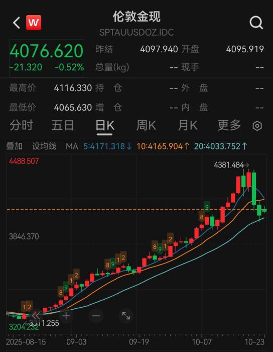 中新网10月23日电(记者 张乃月)10月以来,国际金价连续突破历史高位。由于担心长期涨势过热,金价连续第三天下跌,重返每盎司4000美元左右。数据来源:空中10月22日,金价伦敦金盘中逼近4000美元/盎司。 23日亚洲早盘,伦敦现货黄金报4090美元/盎司附近。彭博社表示,技术指标显示这些上涨的周期可能略有夸大,本周的回调令市场看跌。今年迄今为止,预金价格已上涨近 55%。最近几周,市场对美联储年底前降息至少四分之一个百分点的预期有所增强。ve也支撑了金价。彭博社援引分析师的话说,金价仍维持在4000美元上方,表明价格出现技术性调整,而非根本性变化。不少行业分析师认为,资本利得是近期金价下跌的重要原因。对冲基金 Crescat Capital 的长期投资者 Kevin Smith 表示,本周的回调是健康的,并表示推动金价上涨的许多因素仍然存在。 《华尔街日报》援引苏克顿金融研究团队的分析称,继上周投机性激增之后,投资者正在部分平仓。贵金属价格的回调可能反映了收入紧缩和避险资金流减少,而不是美国国债收益率的趋势。美国国债收益率依然低迷,宏观不确定性持续存在,将继续为其价格提供潜在支撑。